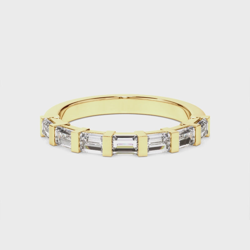 This stunning custom-made anniversary ring features a half band of baguette cut diamonds set on an 18ct gold or platinum band. Exuding fluidity in its line work, and boasting an elegant silhouette, as with all the pieces in our Bespoke Collection, this piece is made especially for you.