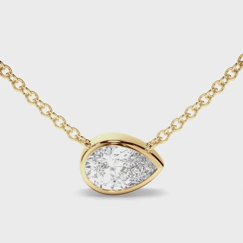 This elegant pear cut diamond necklet, made with your choice of diamond centre stone, features an East West bezel setting and includes a 45cm 18ct gold chain. Exuding fluidity in its line work, and boasting an elegant silhouette, as with all the pieces in our Bespoke Collection, this piece is made especially for you. Pictured here with a 1.50ct Pear Cut Diamond centre stone, a final price is determined following your centre stone selection.