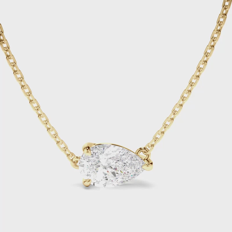 This elegant pear cut diamond necklet, made with your choice of diamond centre stone, features an East West setting and includes a 45cm 18ct gold chain. Exuding fluidity in its line work, and boasting an elegant silhouette, as with all the pieces in our Bespoke Collection, this piece is made especially for you. Pictured here with a 1.50ct Pear Cut Diamond, a final price is determined following your centre stone selection.