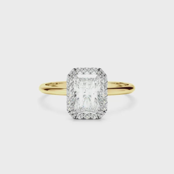 This timeless custom-made engagement ring, made with your choice of diamond centre stone, features a radiant cut diamond adorned in a halo of round brilliant diamonds. Exuding fluidity in its line work, and boasting an elegant silhouette, as with all the pieces in our Bespoke Collection, this piece is made especially for you.