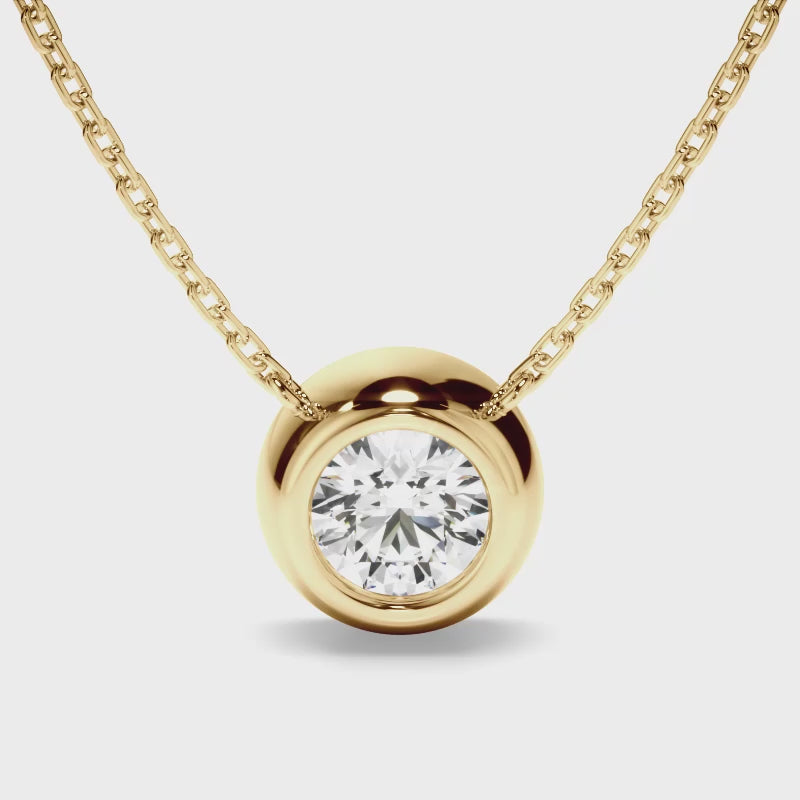 This elegant diamond round bezel set solitaire necklet is made with your choice of diamond centre stone and includes a 45cm 18ct gold chain. Exuding fluidity in its line work, and boasting an elegant silhouette, as with all the pieces in our Bespoke Collection, this piece is made especially for you. Pictured here with a 1.50ct Round Brilliant Cut Diamond centre stone, a final price is determined following your centre stone selection.