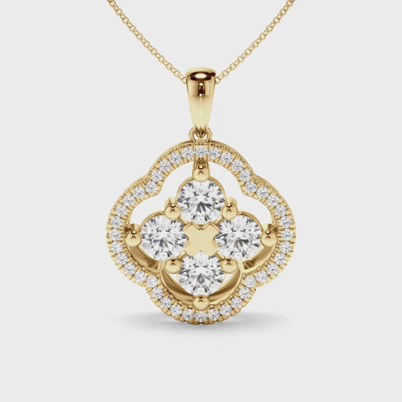 This elegant diamond feature pendant features four 0.25ct round brilliant cut diamonds with a 0.20ct round brilliant cut diamond halo in a clover-like design. Exuding fluidity in its line work, and boasting an elegant silhouette, as with all the pieces in our Bespoke Collection, this piece is made especially for you.
