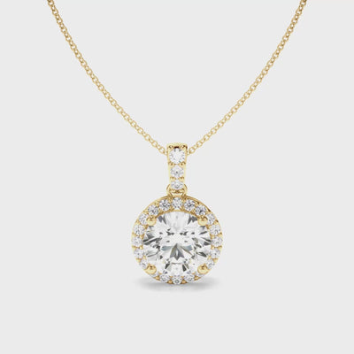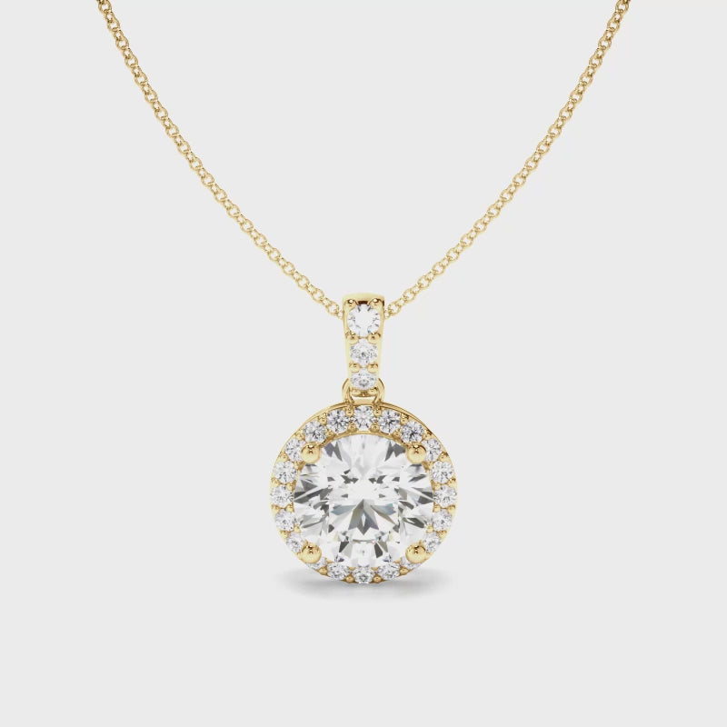 This elegant diamond halo pendant, made with your choice of diamond centre stone, features a minimum 0.10ct round brilliant cut diamond halo and bail. Exuding fluidity in its line work, and boasting an elegant silhouette, as with all the pieces in our Bespoke Collection, this piece is made especially for you. Pictured here with a 1.00ct Round Brilliant Cut Diamond centre stone, a final price is determined following your centre stone selection.